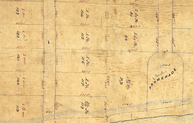 Western waterfront of plan, showing (mostly) one-acre lots west of the subdivision’s private promenade.