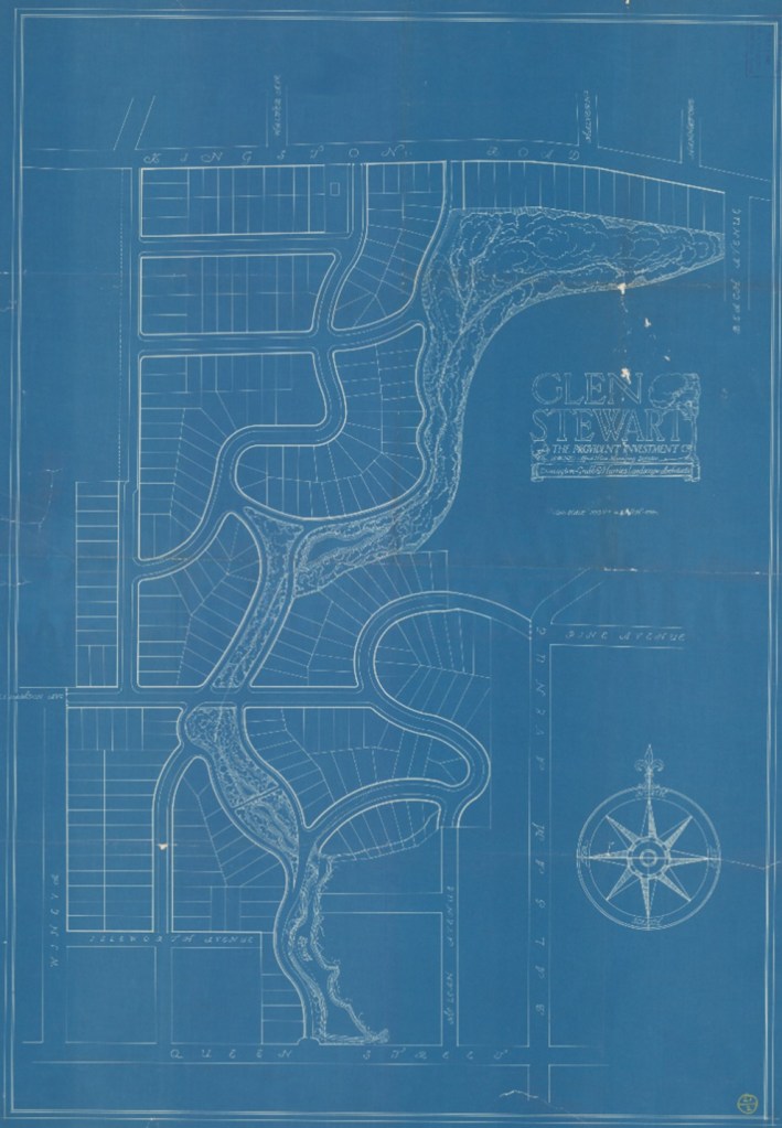 The Beaches is not a planned or designed neighbourhood. Most of its streets and building lots were laid out not by landscape architects or city planners seeking beauty and efficiency for the public good, but by private landowners seeking profit for their own personal gain. And most of its houses were designed not by architects but by the competent, if not especially innovative, builders who built them. This, for better or worse, is the character of the neighbourhood. There is however one important exception – the Glen Manor district, or ‘Stewart Manor’ as it was initially called, a residential precinct built either side of the neighbourhood’s central ravine in the 1920s and 30s. Just a casual stroll along its curving, sloping streets will reveal it to have been planned and designed throughout.